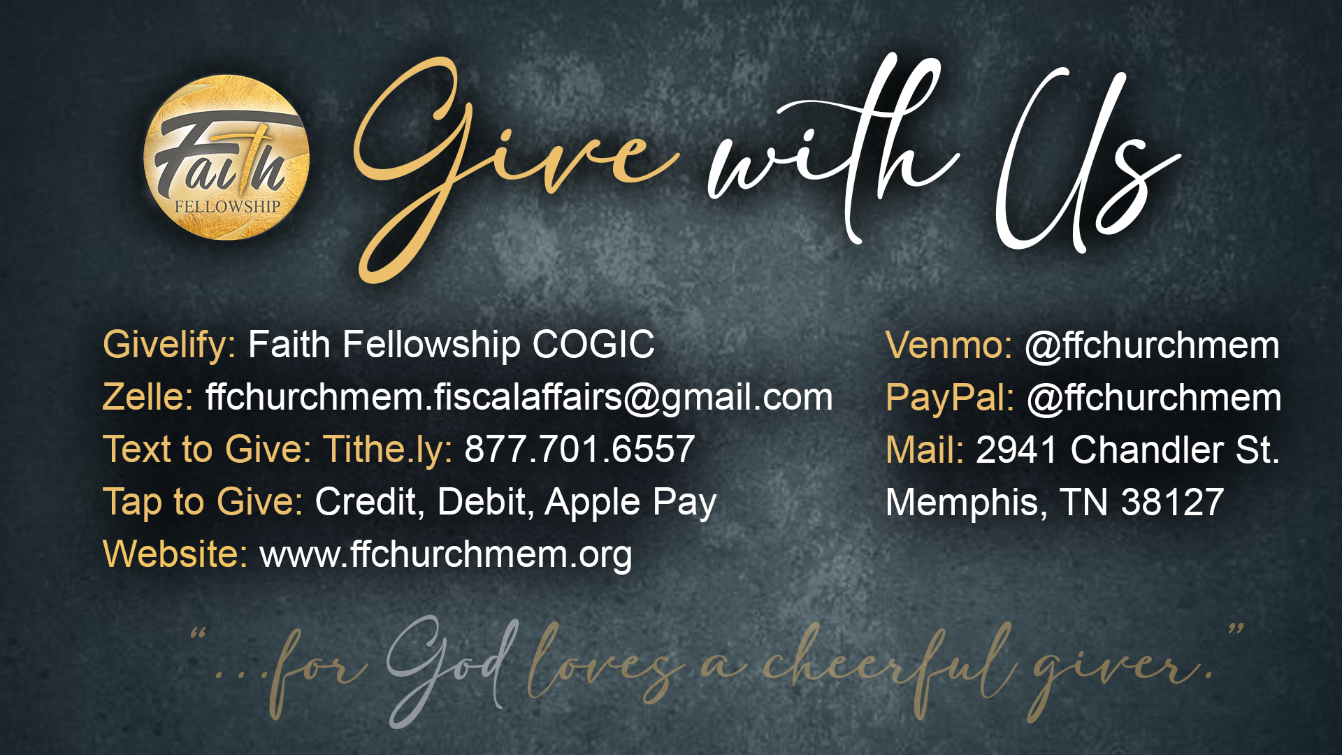 Thank you for sowing into the life, the vision, and the mission of Faith Fellowship Church. We pray that you are giving with a grateful heart.